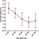 Figure 7 to Figure 10, Table 2 and Table 3 show that the soil in the KFP plantation is alkaline with an average pH of 8.71; the pH of the surface soil (0-20 cm and 20-40 cm) fluctuates less than that of the deep soil. The soil organic matter content, total nitrogen content, and total carbon content all decreased with soil depth. The mean value of the organic matter content in the surface soil (0-20 cm) was 26.00 g/kg, the total nitrogen content was 1.73 g/kg, and total carbon was 3.87%; All minimum values but total carbon content were found in the deepest soil layer (80-100 cm), with an organic matter of 7.47 g/kg, a total nitrogen of 0.51 g/kg, and a total carbon of 1.98%.